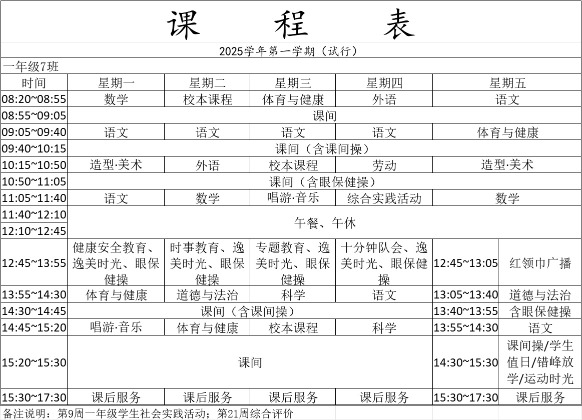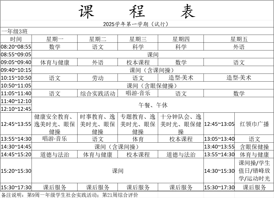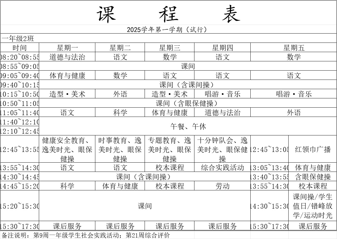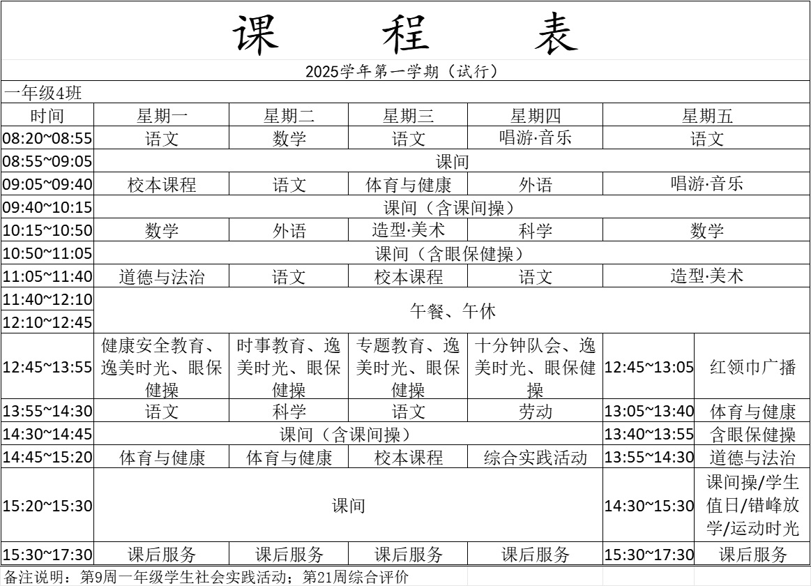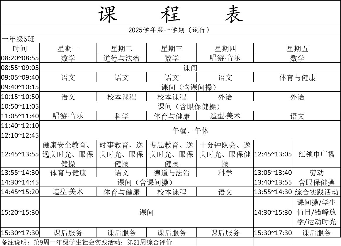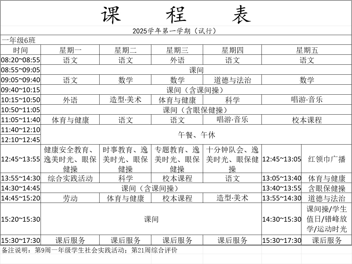 青浦区逸夫小学2025学年第一学期一年级课程表