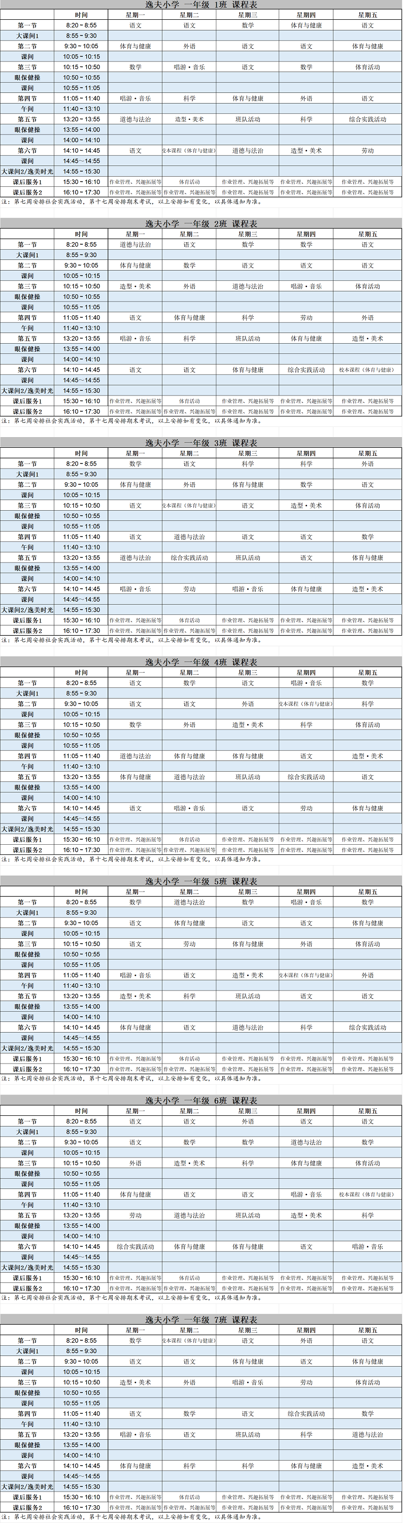 青浦区逸夫小学2025学年第二学期一年级课程表
